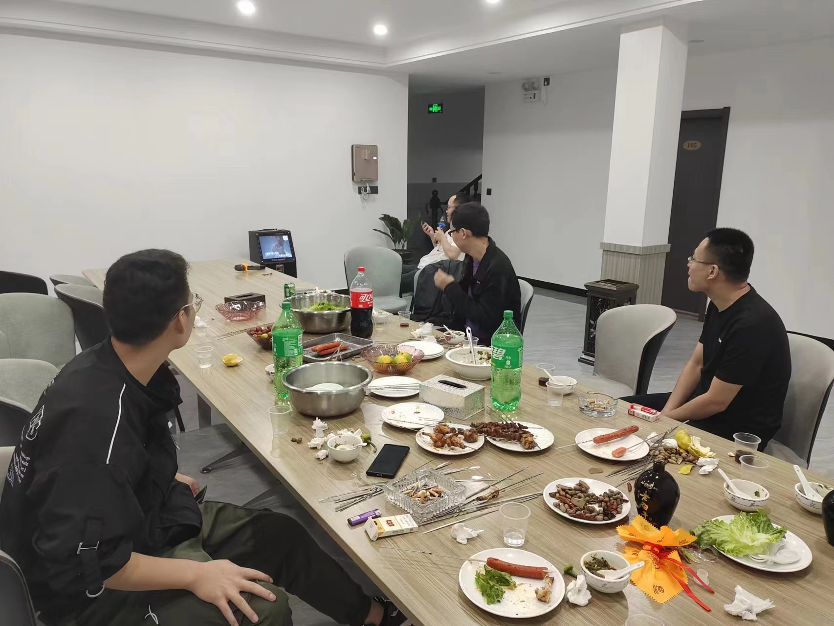 好吃的烤肉上來后,大家坐在餐桌旁,民宿老板拿來了K歌設備,小伙伴們瞬間轉換成一個個“歌唱家”,屋外細雨,屋檐下烤堂,屋內“演唱會”現場,熱鬧非凡,即便是山里夜晚空氣變涼,但是大家的熱情卻也將整個民宿烘托的暖洋洋。