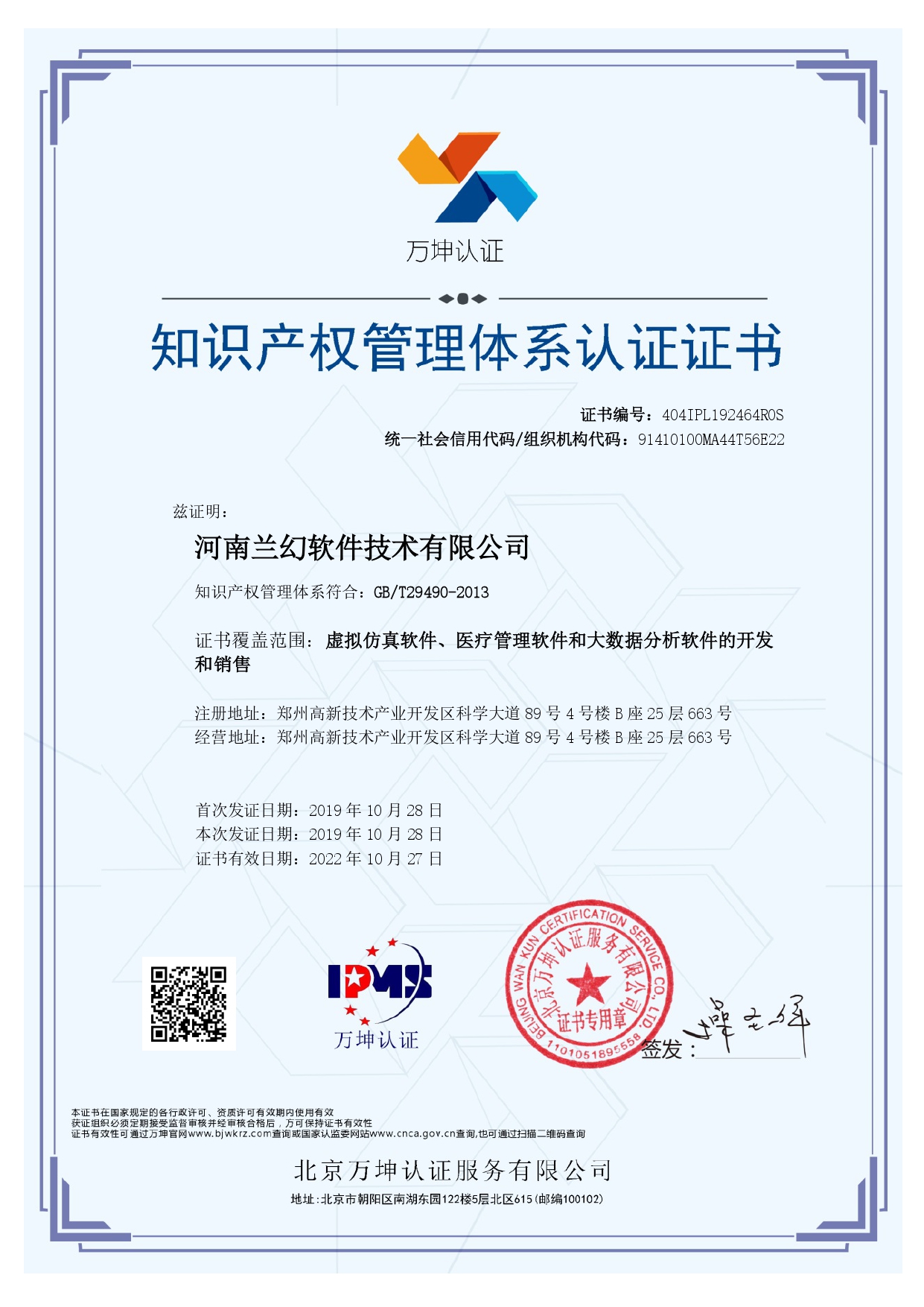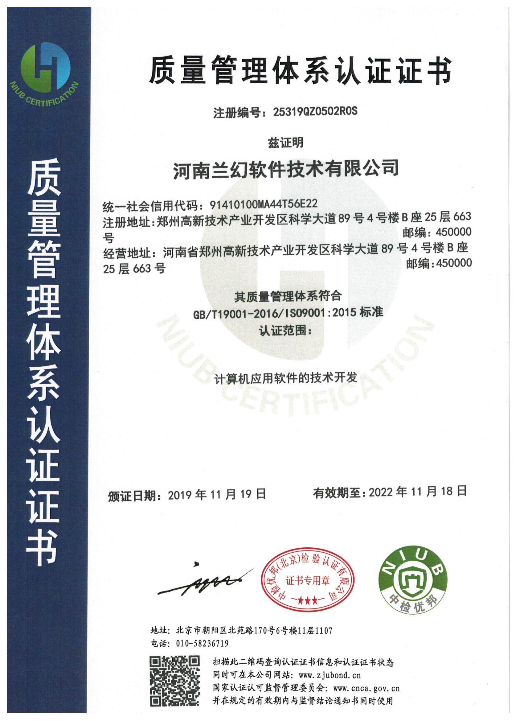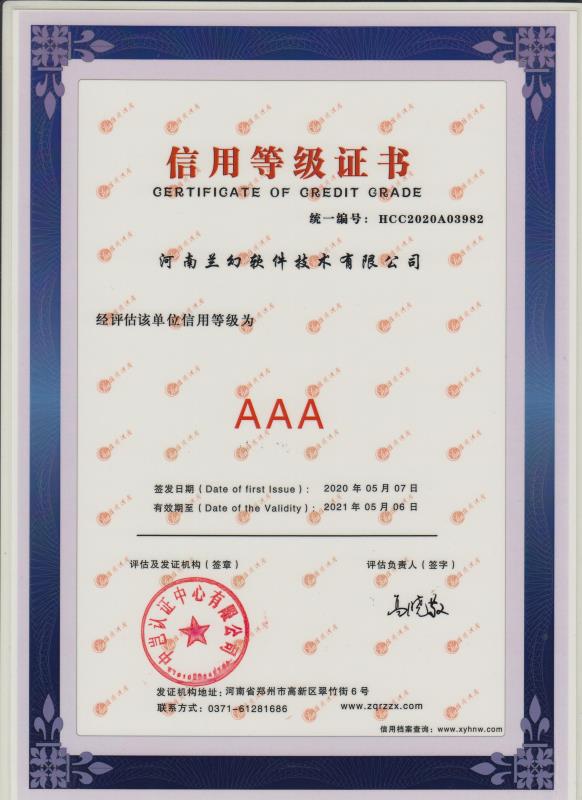 2019年獲得河南軟件協(xié)會"雙軟"認(rèn)證、ISO9001質(zhì)量管理體系認(rèn)證、 知識產(chǎn)權(quán)管理體系認(rèn)證。
