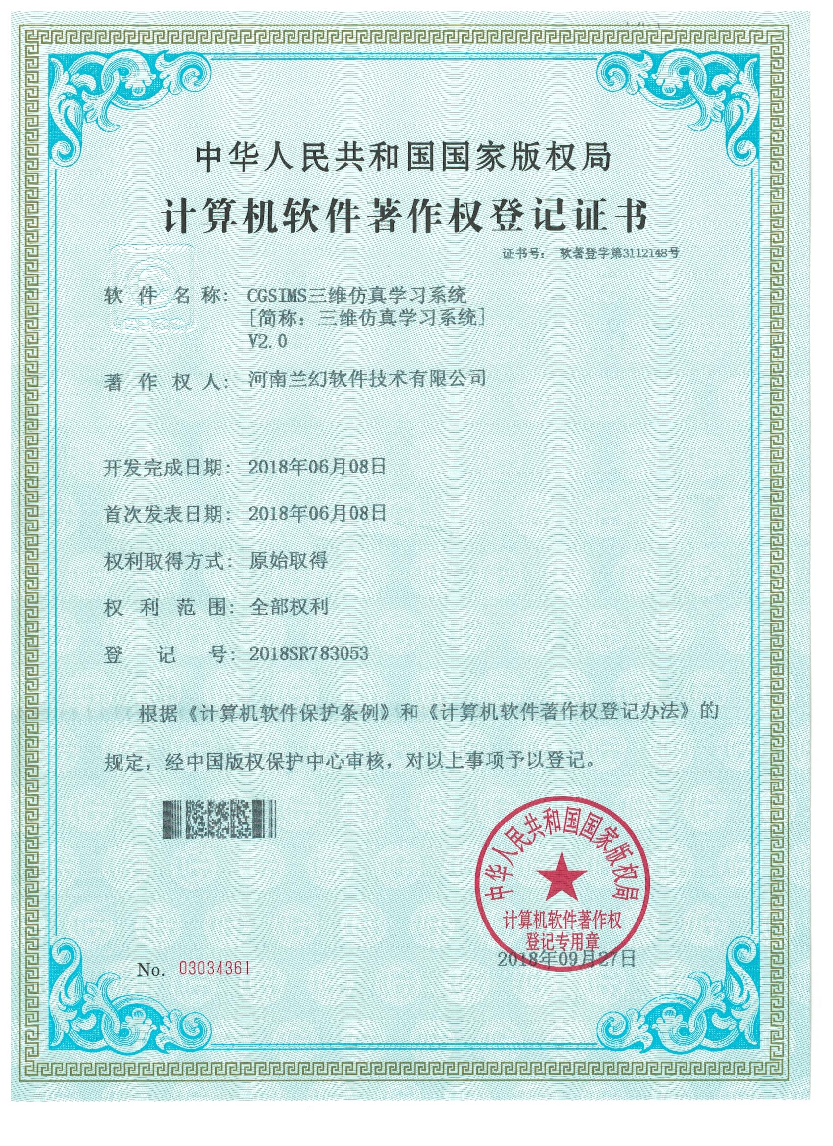 化工實(shí)訓(xùn)仿真著作權(quán)證書 CGSIMS-三維仿真學(xué)習(xí)系統(tǒng)著作權(quán)證書 區(qū)域網(wǎng)絡(luò)血壓管理系統(tǒng)著作權(quán)證書