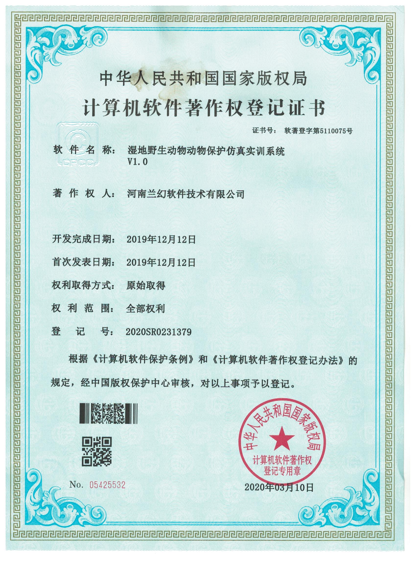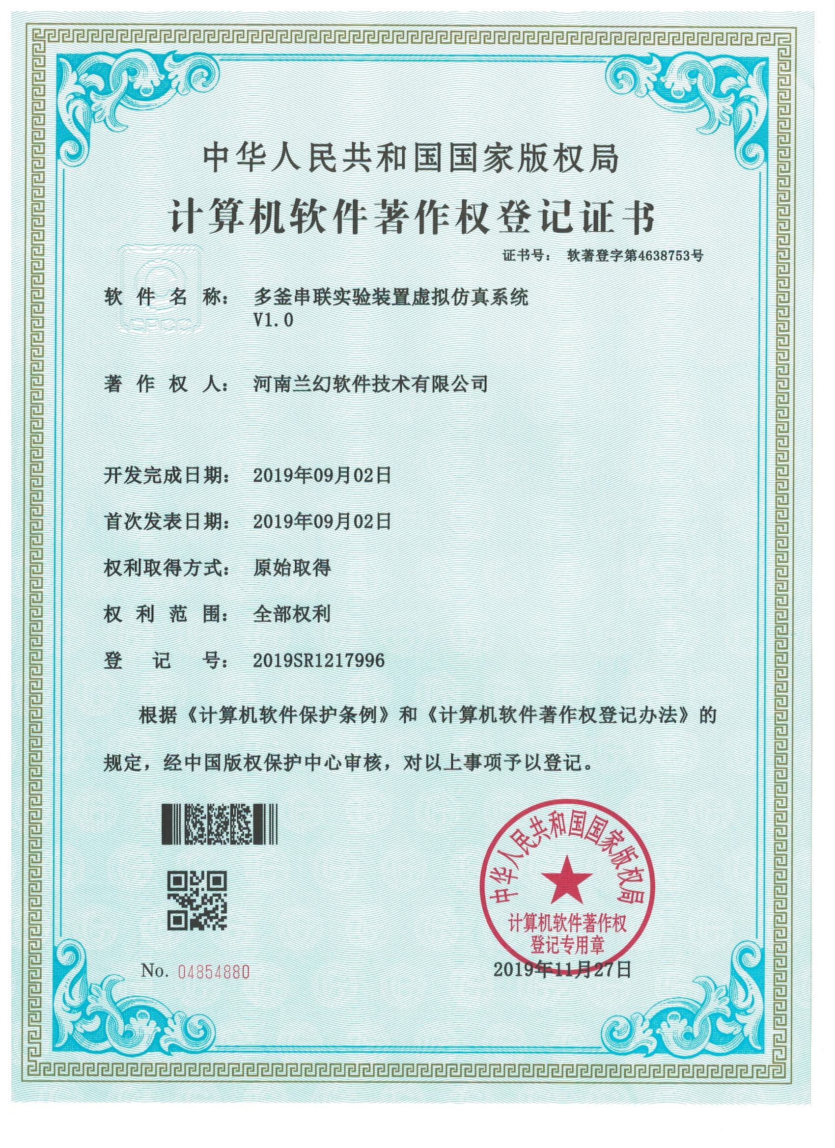 濕地野生動物保護(hù)仿真實(shí)訓(xùn)系統(tǒng)著作權(quán)證書 雙套管傳熱實(shí)驗(yàn)裝置虛擬仿真系統(tǒng)著作權(quán)證書 多釜串聯(lián)實(shí)驗(yàn)裝置虛擬仿真系統(tǒng)著作權(quán)證書